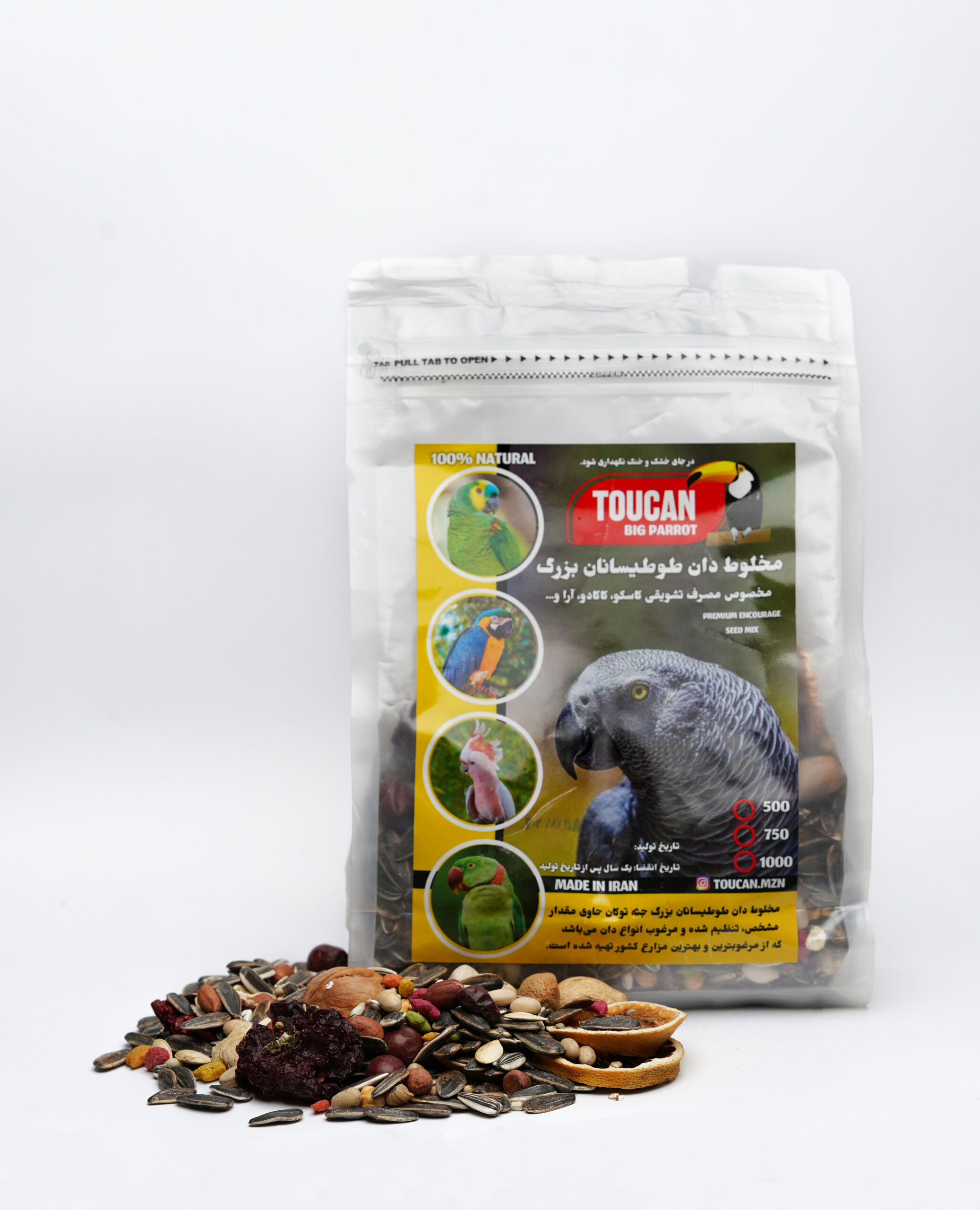 غذای مخصوص طوطیسانان بزرگ توکان از بهترین و مرغوب ترین دانه ها و آجیل ها جهت استفاده طوطیسانانی بزرگ جثه مانند کاسکو کاکادو آرا و… تهیه شده است. این محصول حاوی تخمه،بادام،پسته، فندق، انجیر، نارگیل، تخمه کدو ، میوه جات خشک و… می باشد.